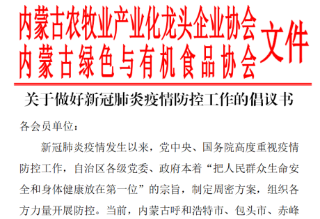 一、內(nèi)蒙古農(nóng)牧業(yè)產(chǎn)業(yè)化龍頭企業(yè)協(xié)會(huì)聯(lián)合內(nèi)蒙古綠色與有機(jī)食品協(xié)會(huì),發(fā)布了《關(guān)于做好新冠肺炎疫情防控工作的倡議書(shū)》,引導(dǎo)各會(huì)員單位堅(jiān)決遏止借機(jī)囤積居奇、哄抬物價(jià)、虛假宣傳等破壞市場(chǎng)秩序、損害消費(fèi)者合法權(quán)益的不法行為,堅(jiān)決遏制疫情擴(kuò)展蔓延,積極投身新型冠狀病毒防控戰(zhàn)役中。